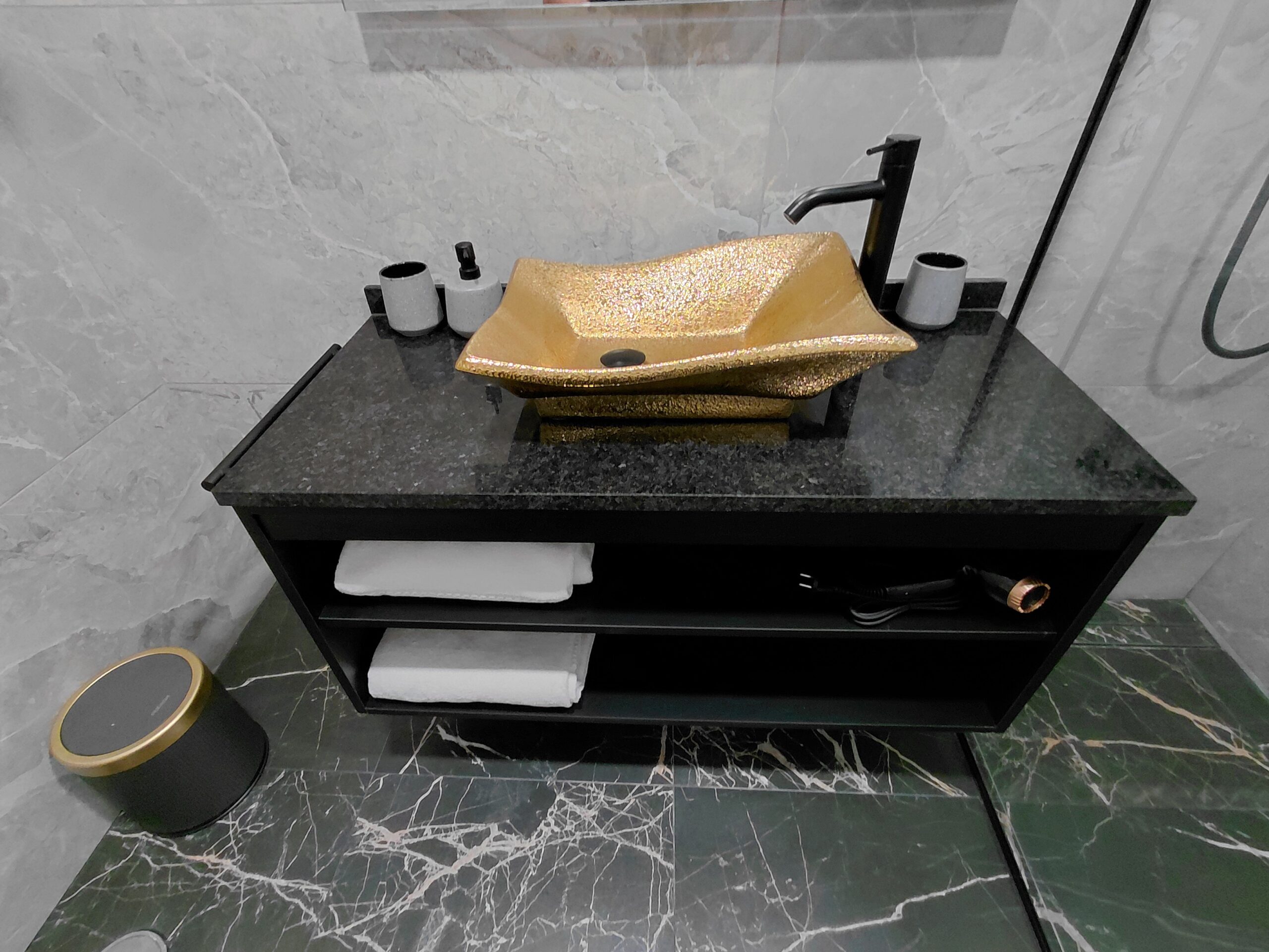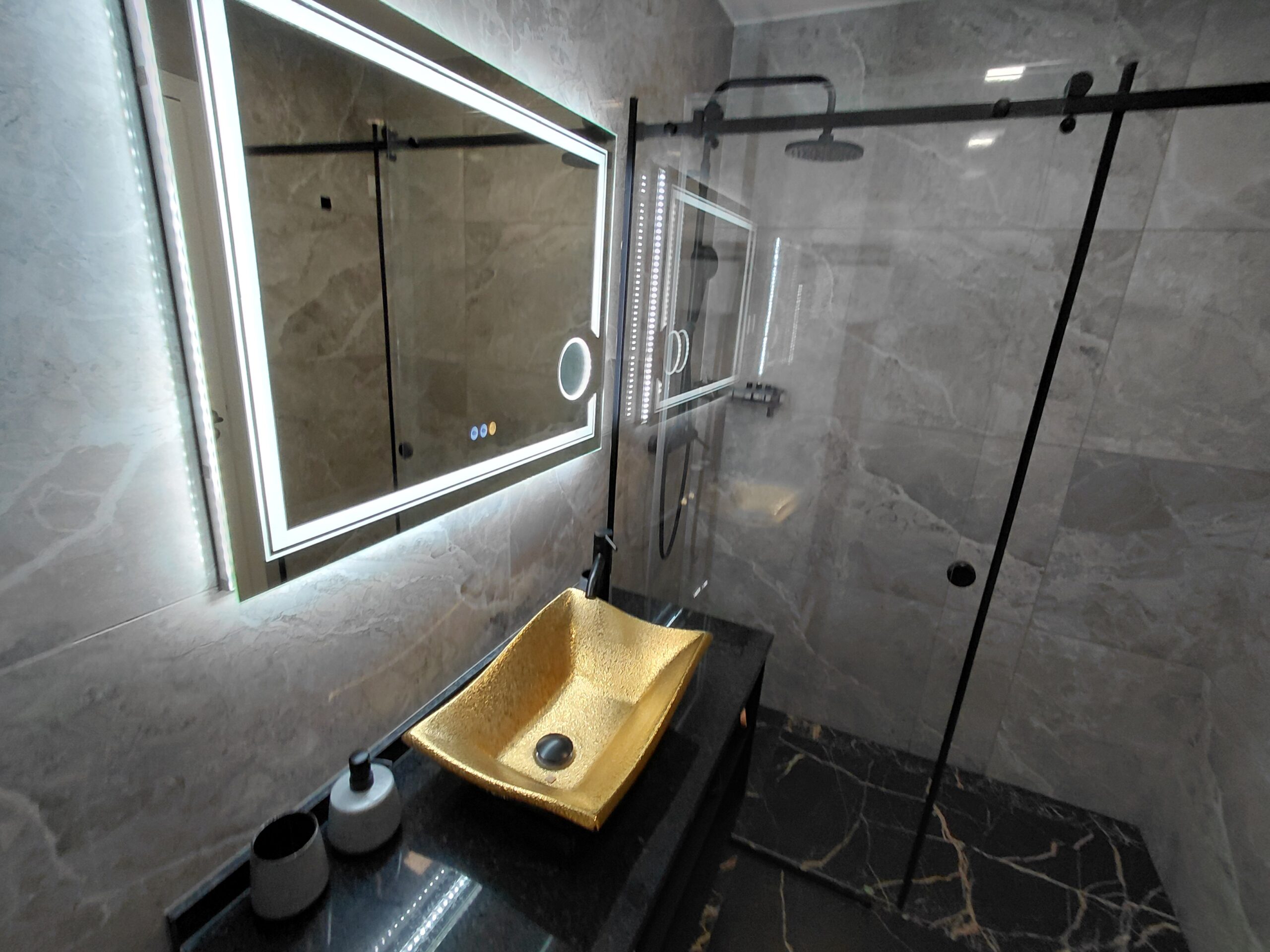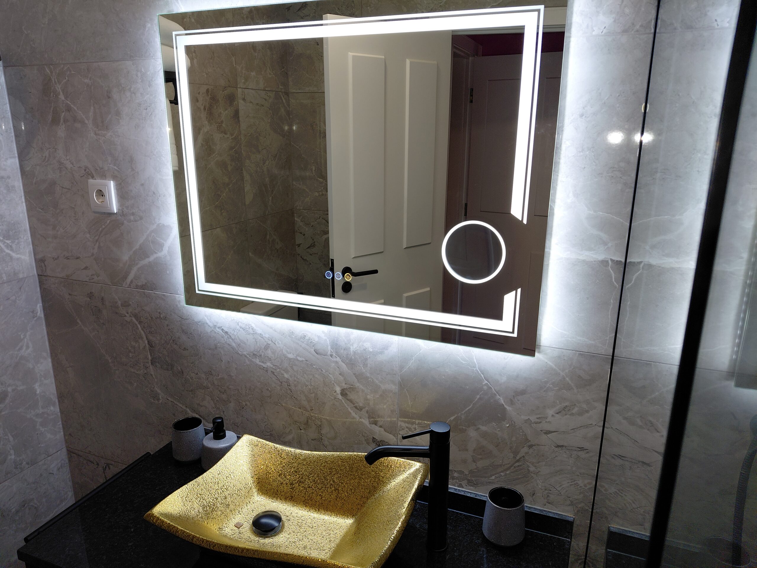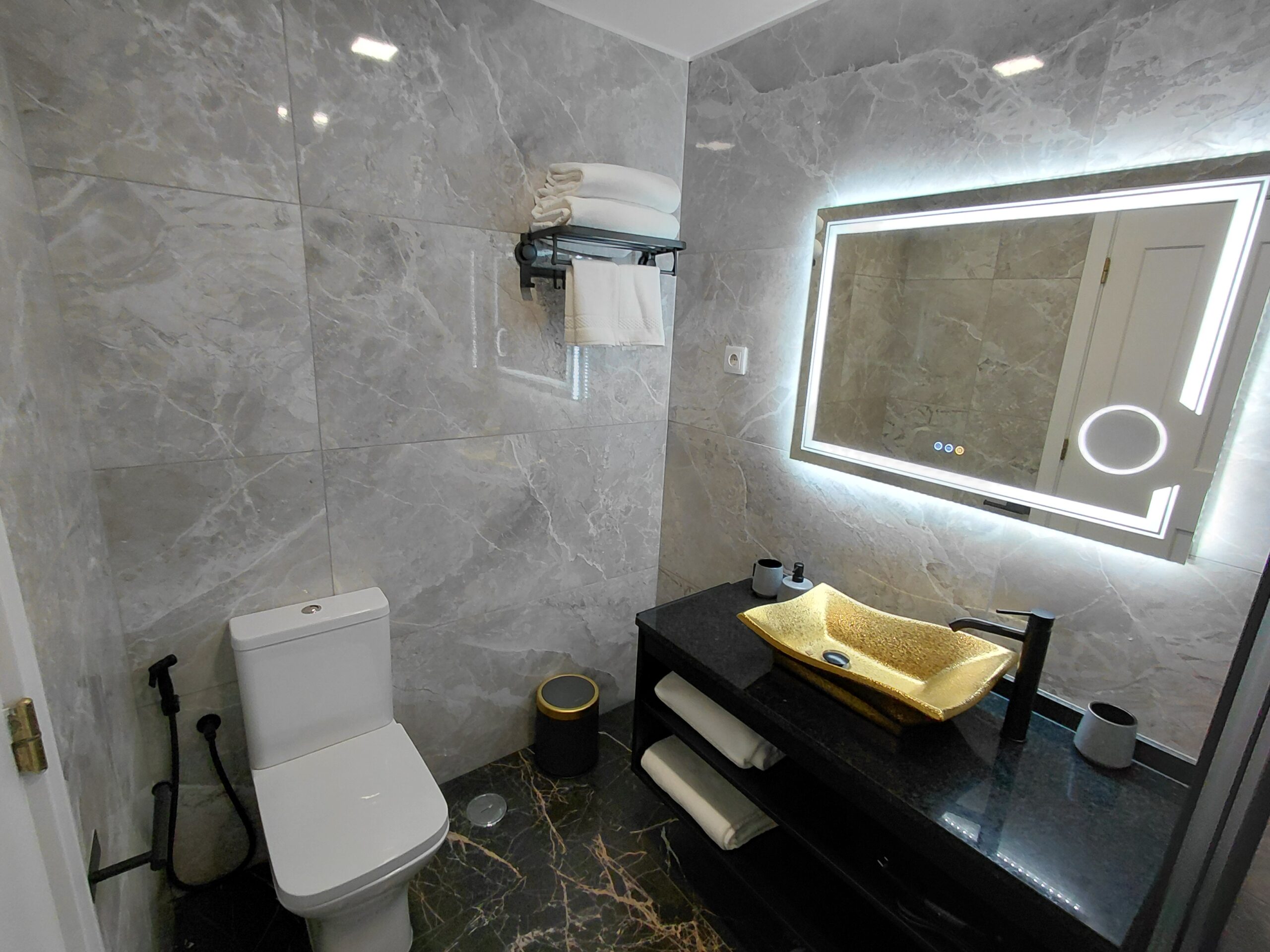 Bathroom Amenities: Illuminated multi-function wall mirror with defogging feature, make-up/vanity mirror, oversized walk-in shower, curated hygiene essentials, shower cap, and professional-grade hair dryer