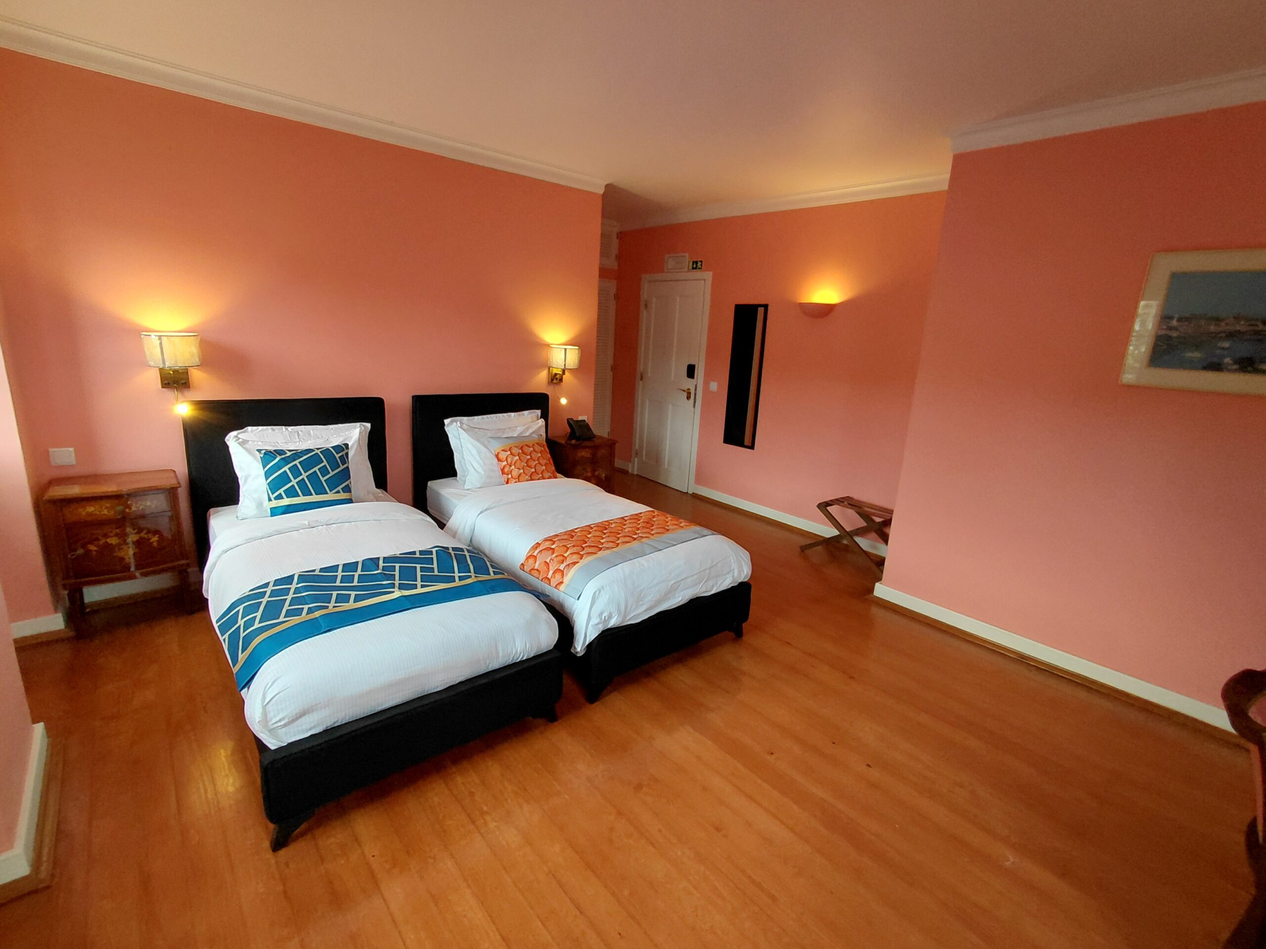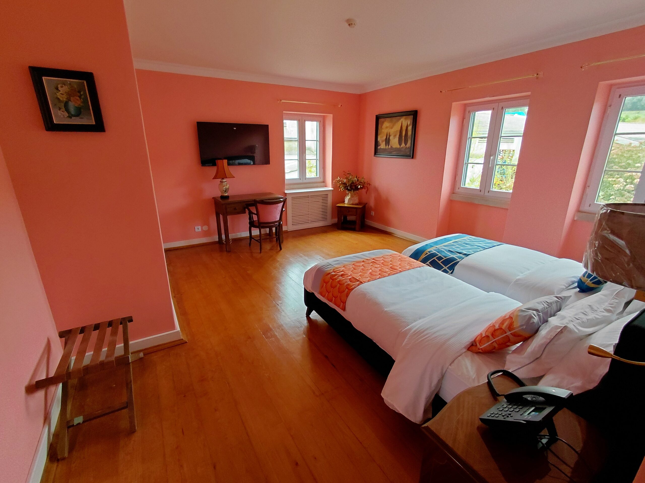 Immerse yourself in the serene sophistication of the Coral Room, adorned in soft, luminous salmon-pink tones. This first-floor sanctuary offers two exquisitely appointed twin beds and is drenched in natural light, highlighting views of verdant gardens. A haven of tranquility, the Coral Room invites you to unwind in understated elegance and refined comfort.