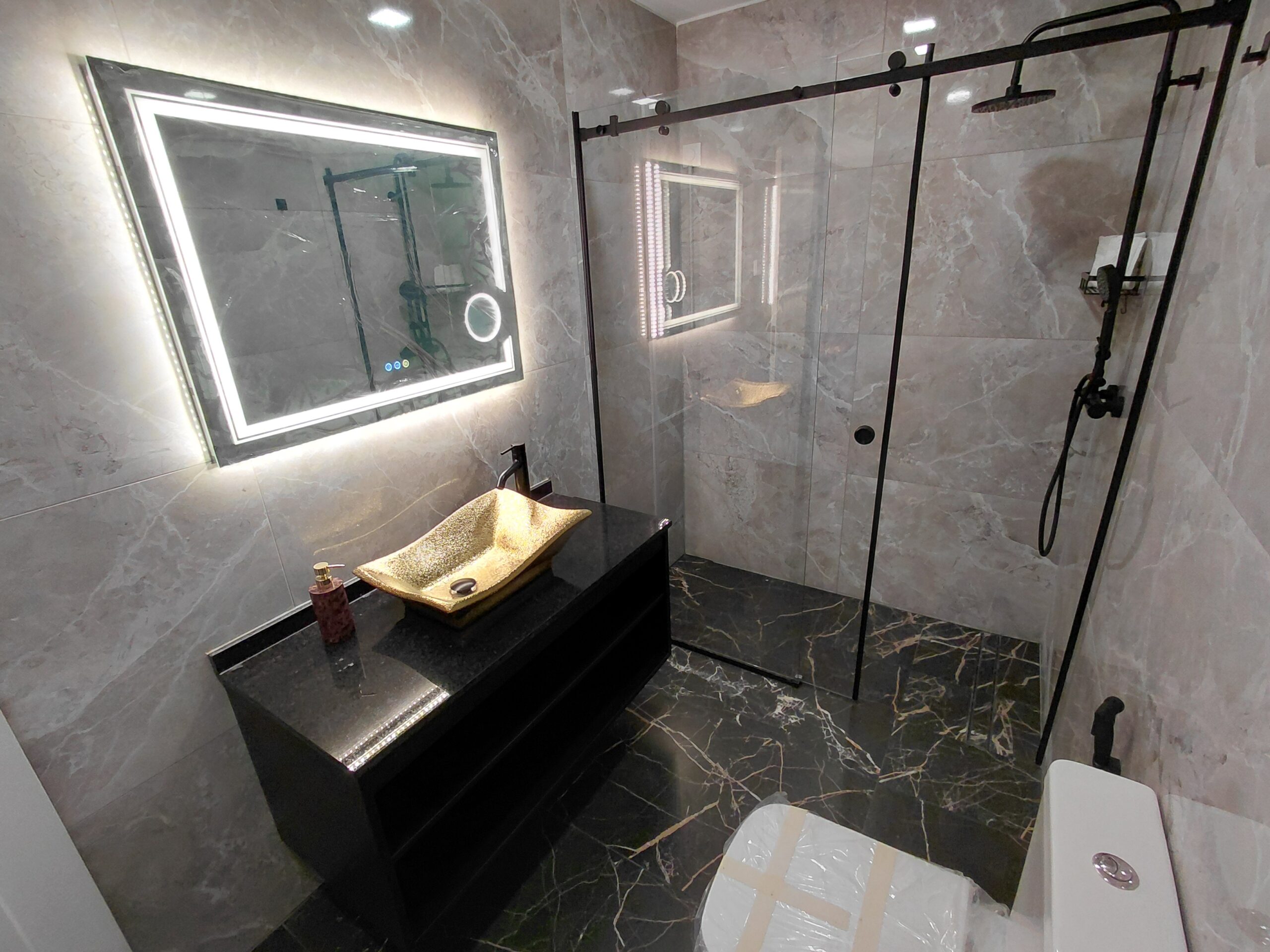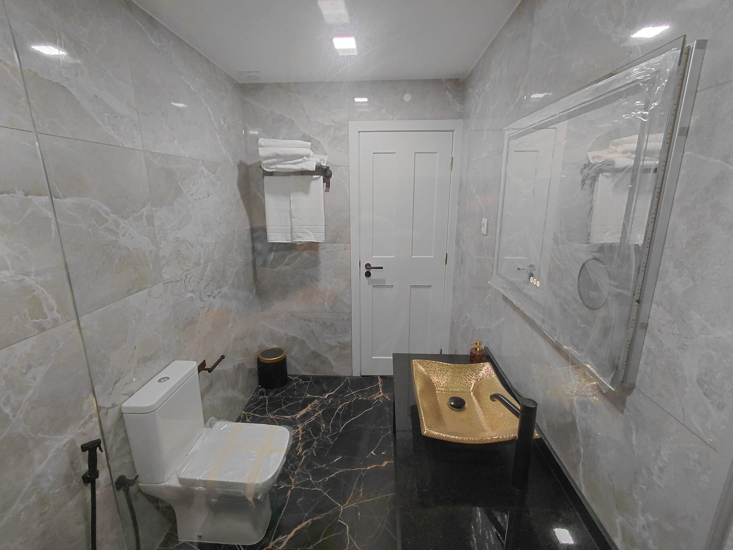 Bathroom Amenities: Illuminated multi-function wall mirror with defogging feature, make-up/vanity mirror, oversized walk-in shower, curated hygiene essentials, shower cap, and professional-grade hair dryer