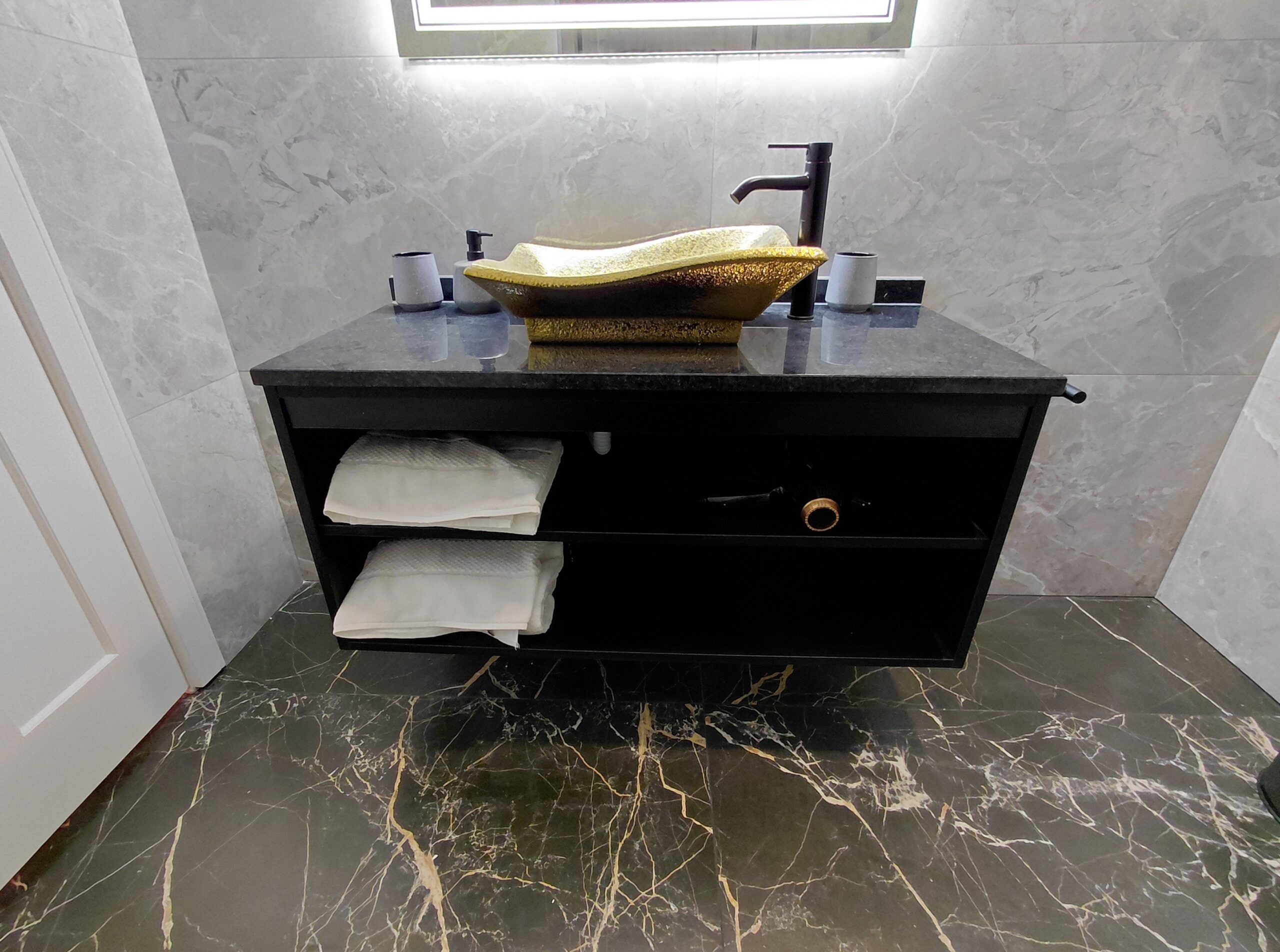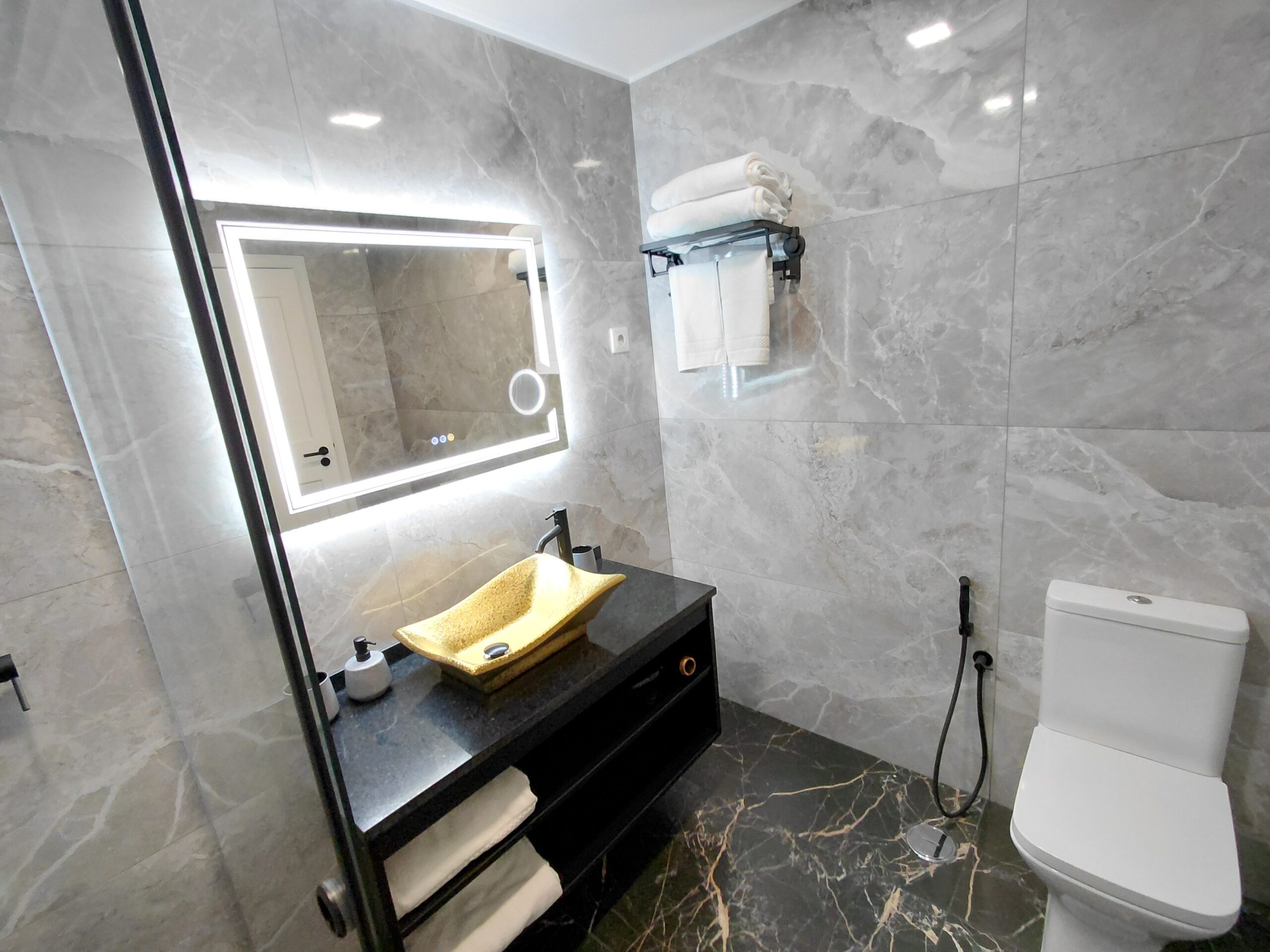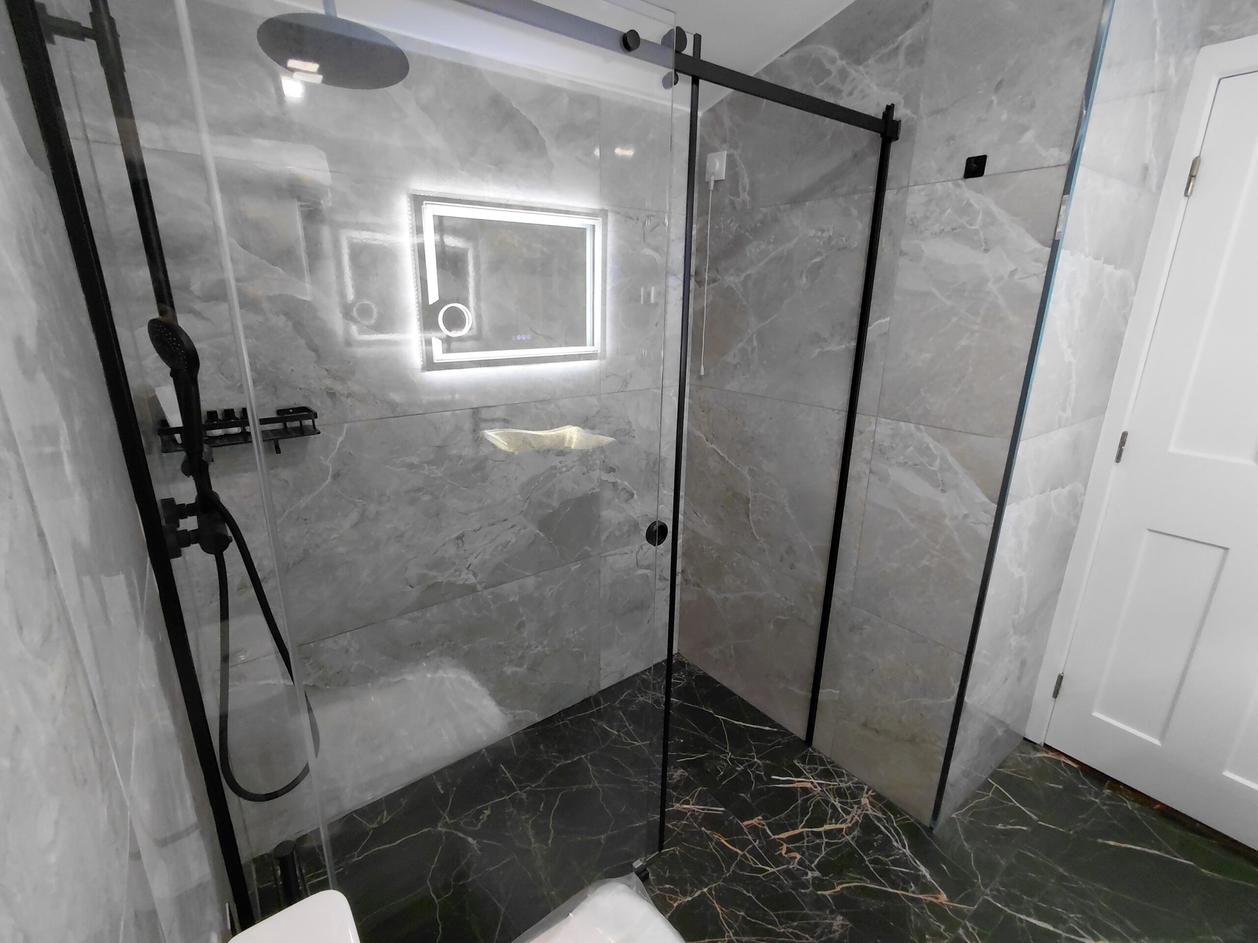 Bathroom Amenities: Illuminated multi-function wall mirror with defogging feature, make-up/vanity mirror, oversized walk-in shower, curated hygiene essentials, shower cap, and professional-grade hair dryer