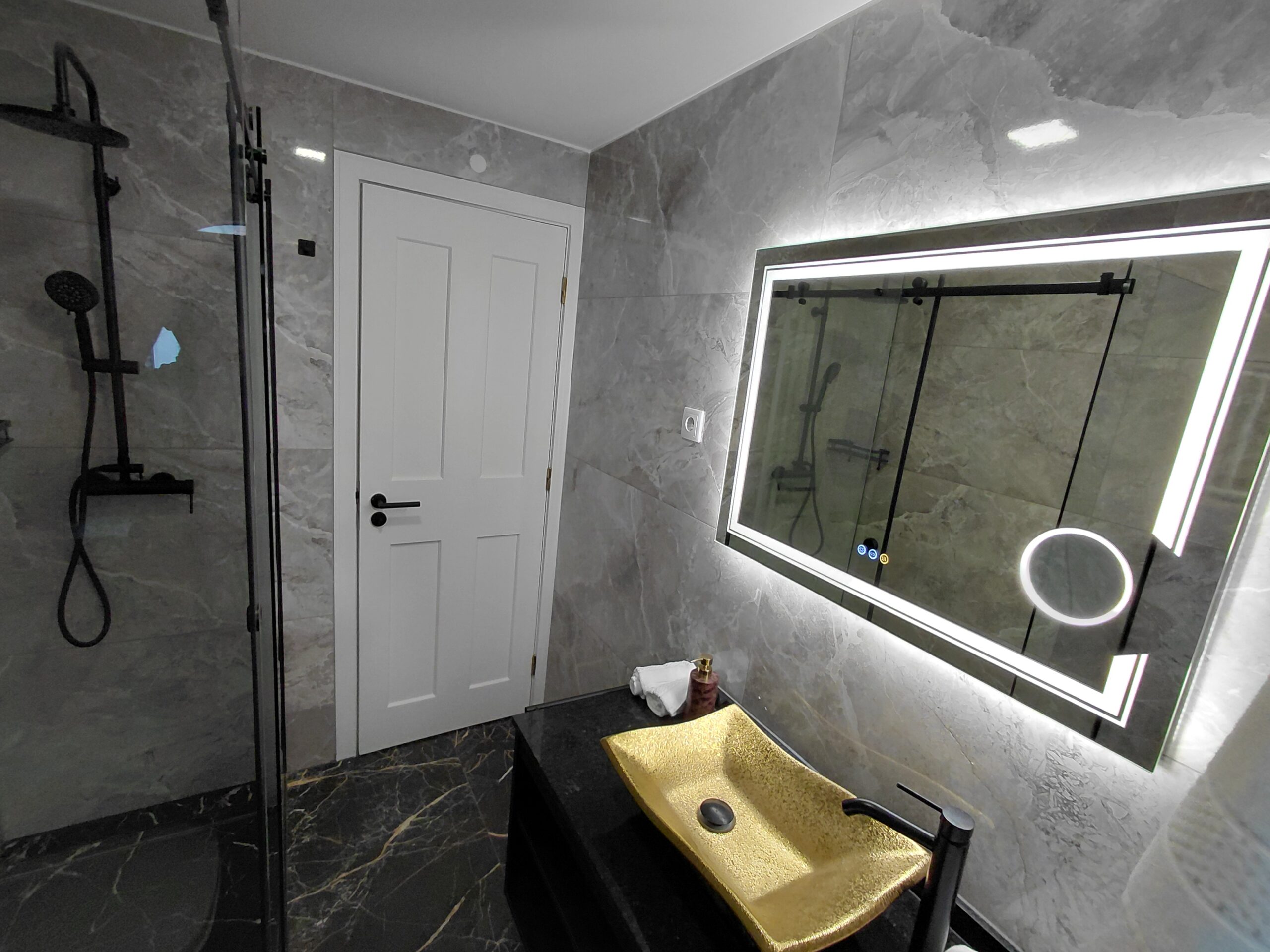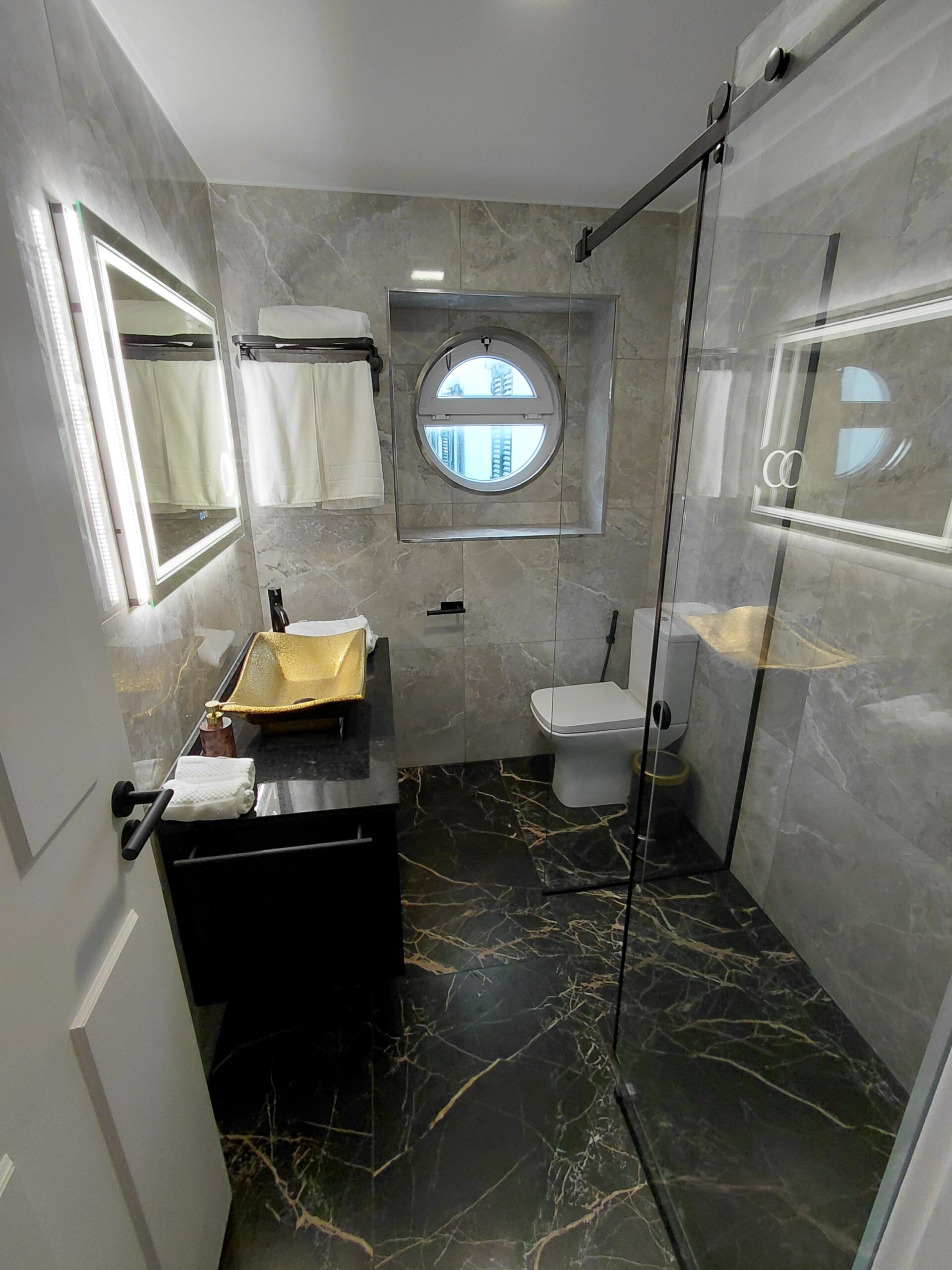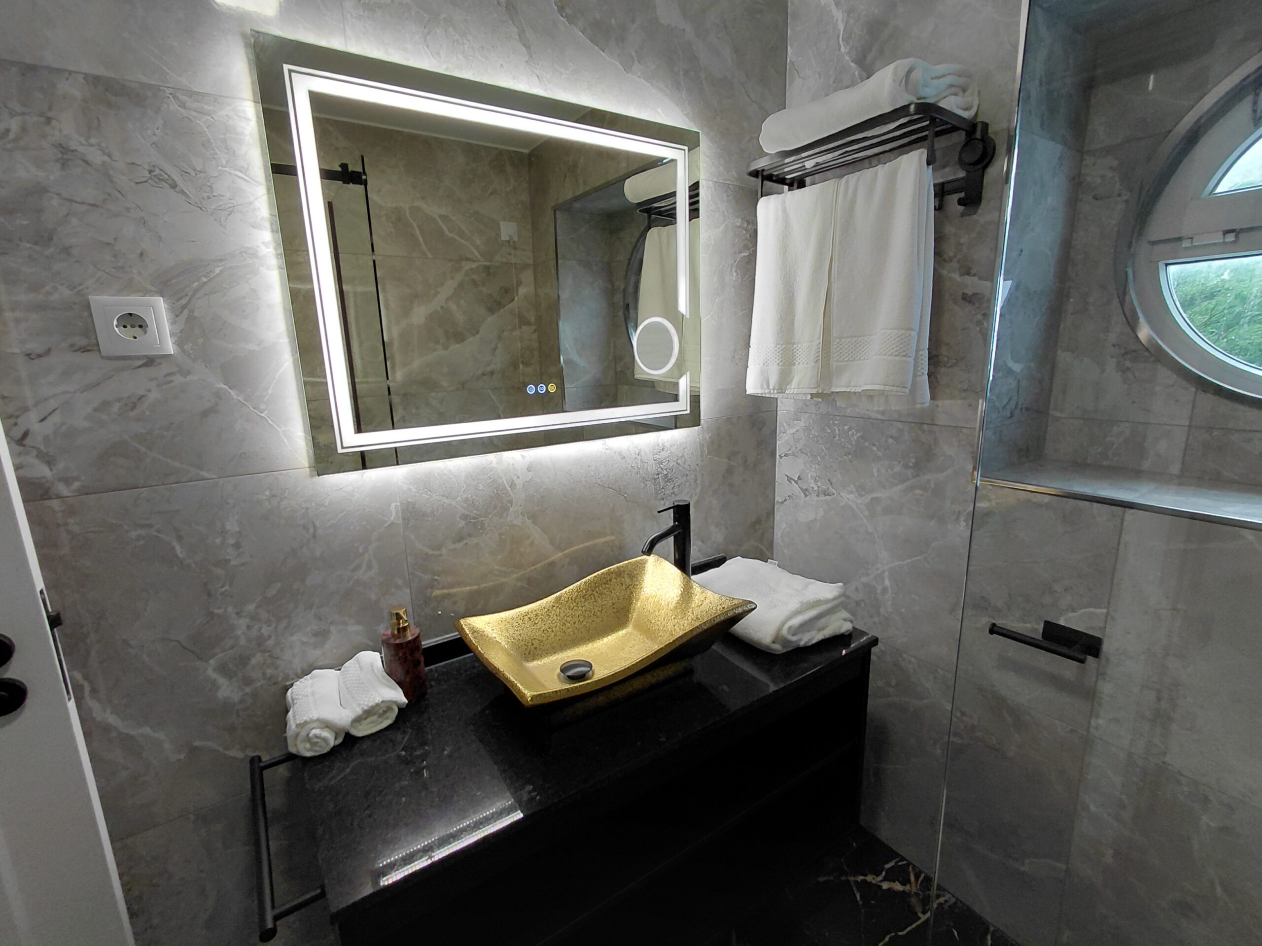 Bathroom Amenities: Illuminated multi-function wall mirror with defogging feature, make-up/vanity mirror, oversized walk-in shower, curated hygiene essentials, shower cap, and professional-grade hair dryer