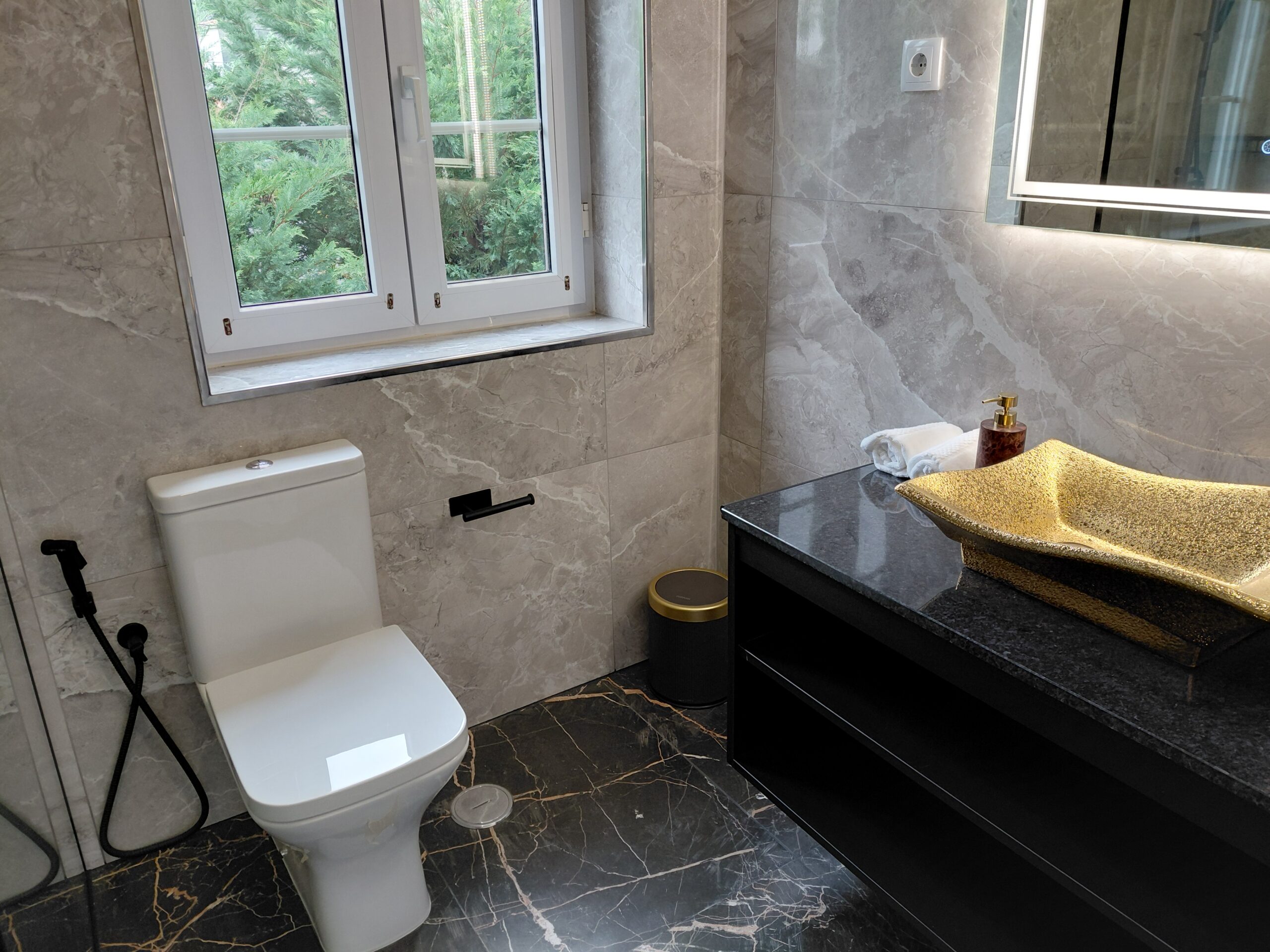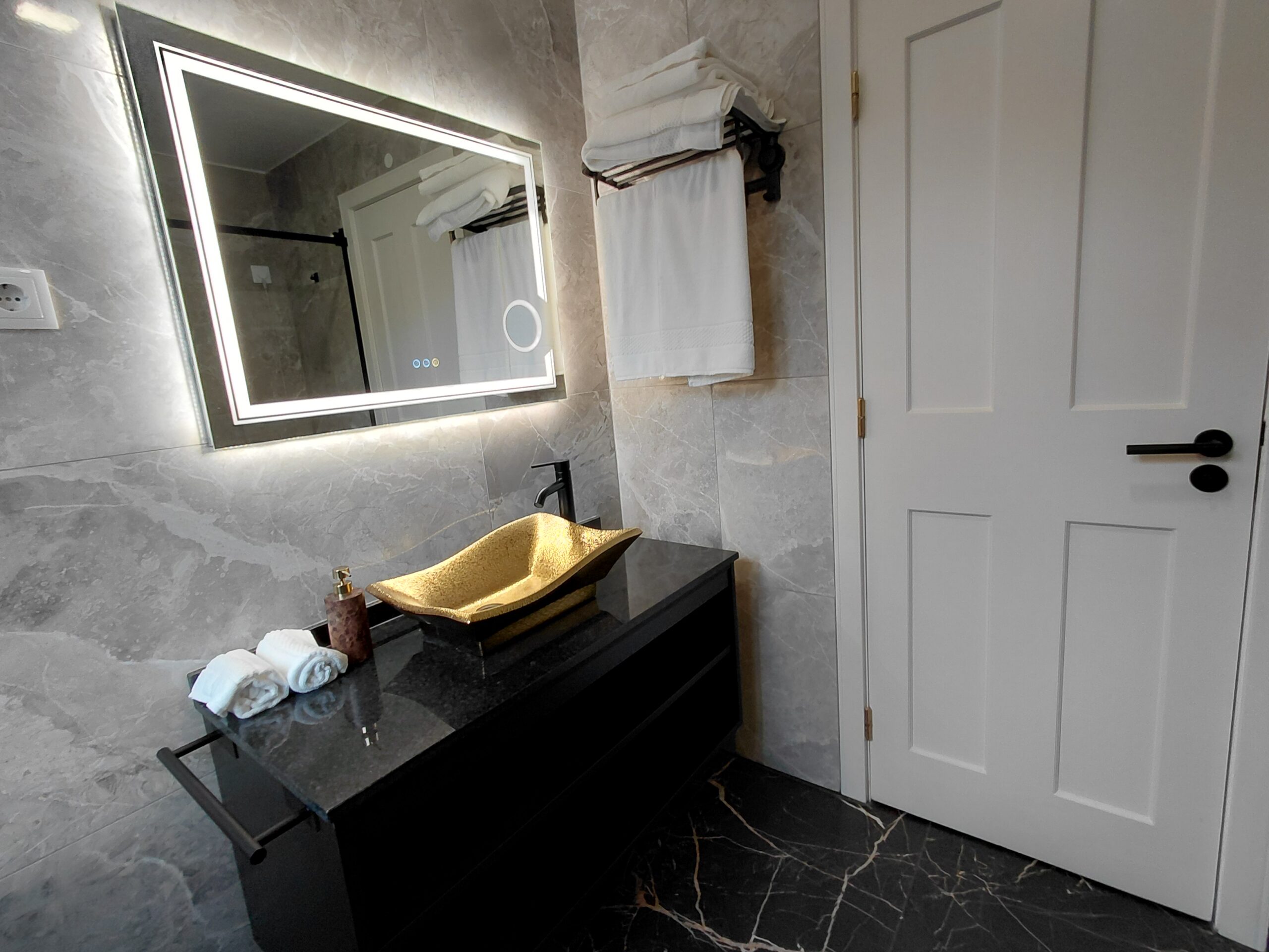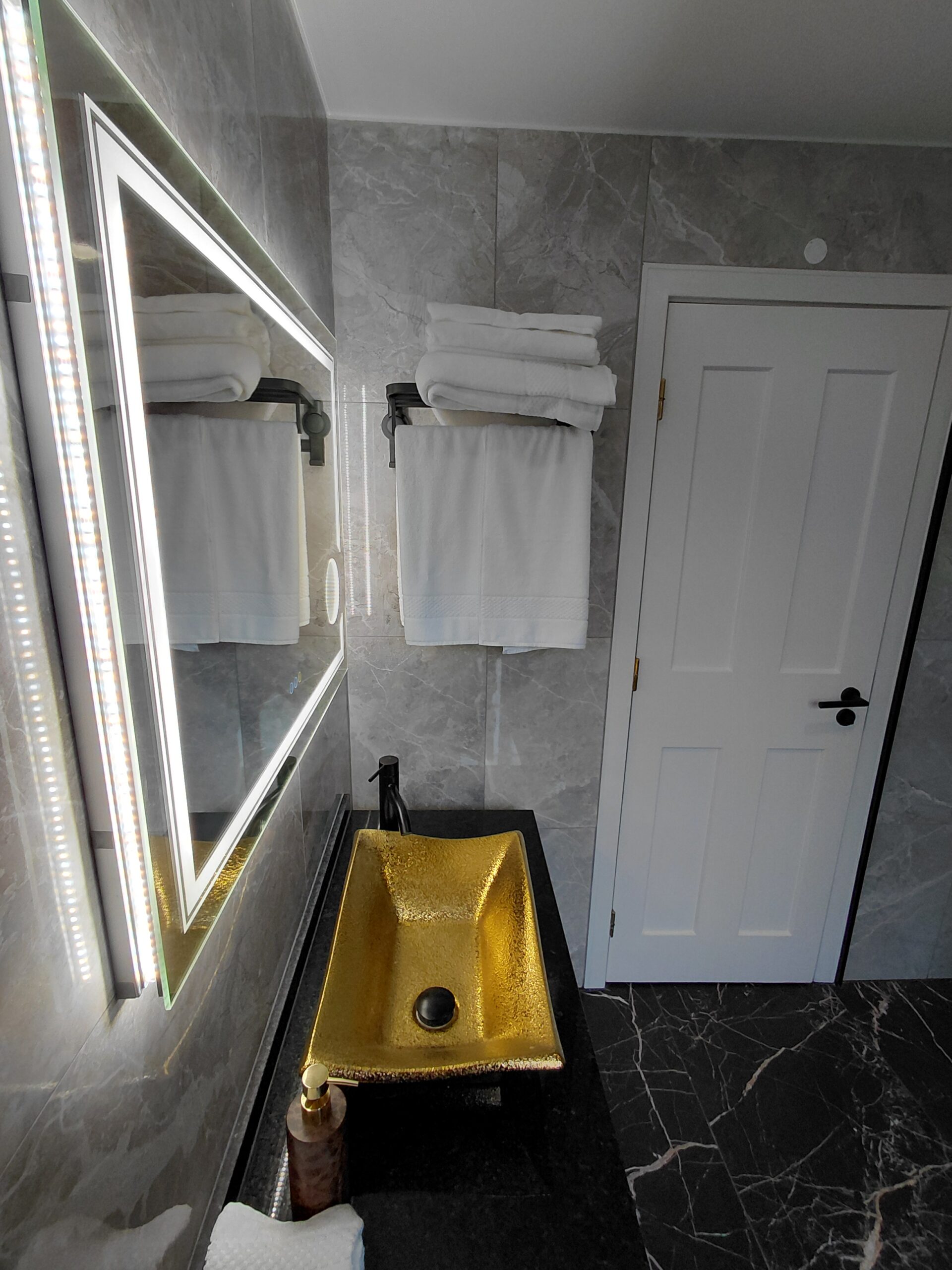 Bathroom Amenities: Illuminated multi-function wall mirror with defogging feature, make-up/vanity mirror, oversized walk-in shower, curated hygiene essentials, shower cap, and professional-grade hair dryer.