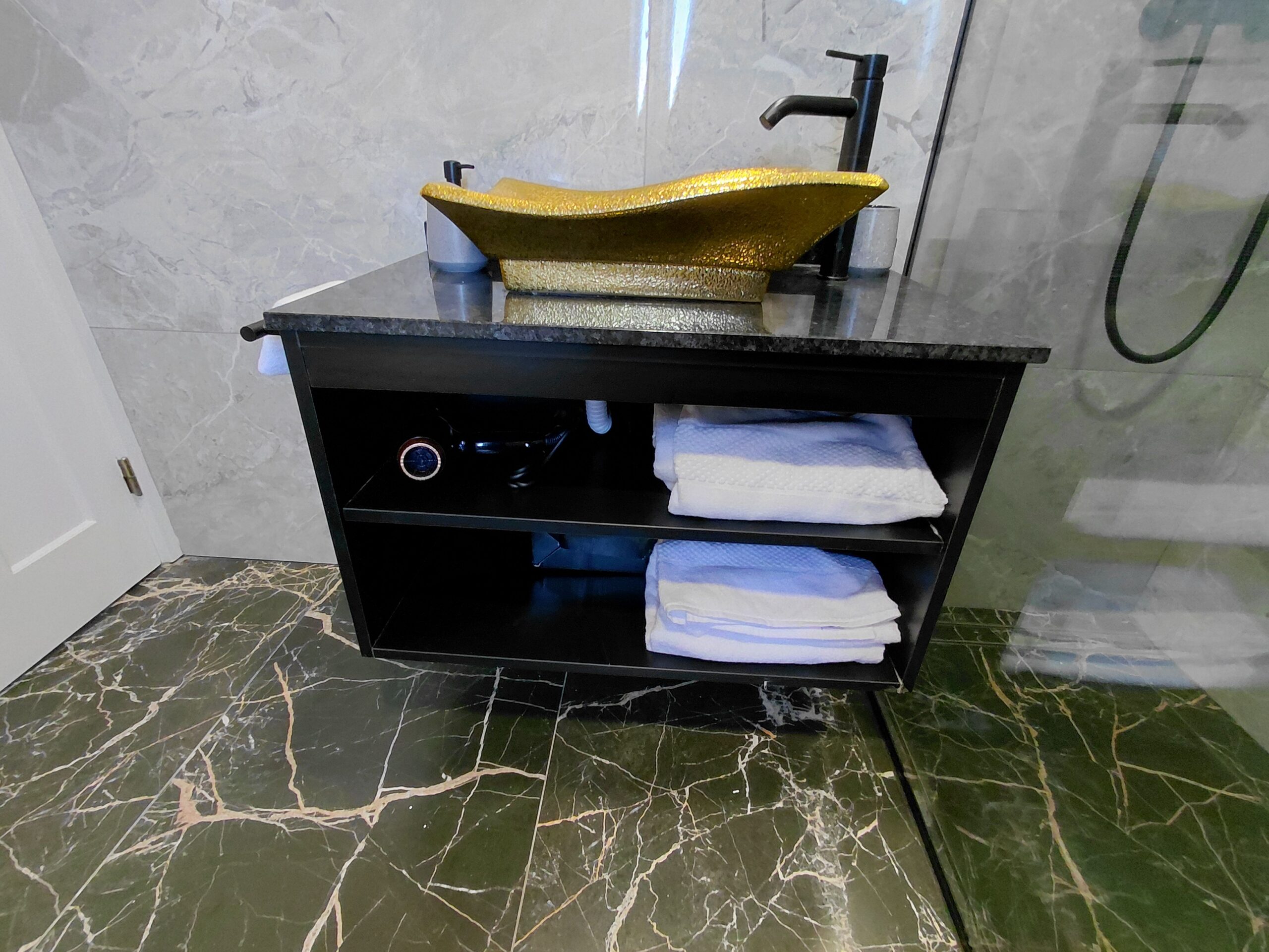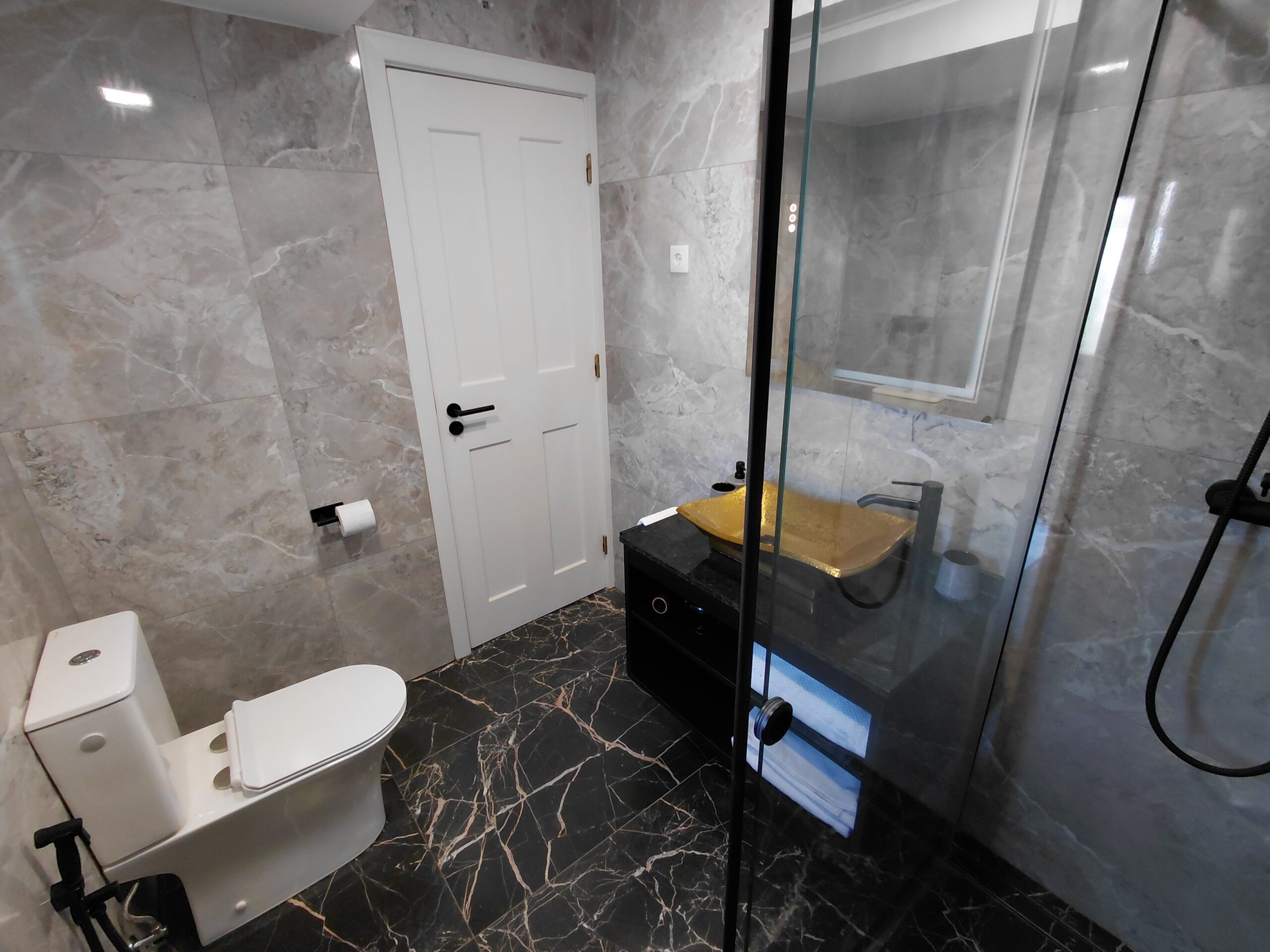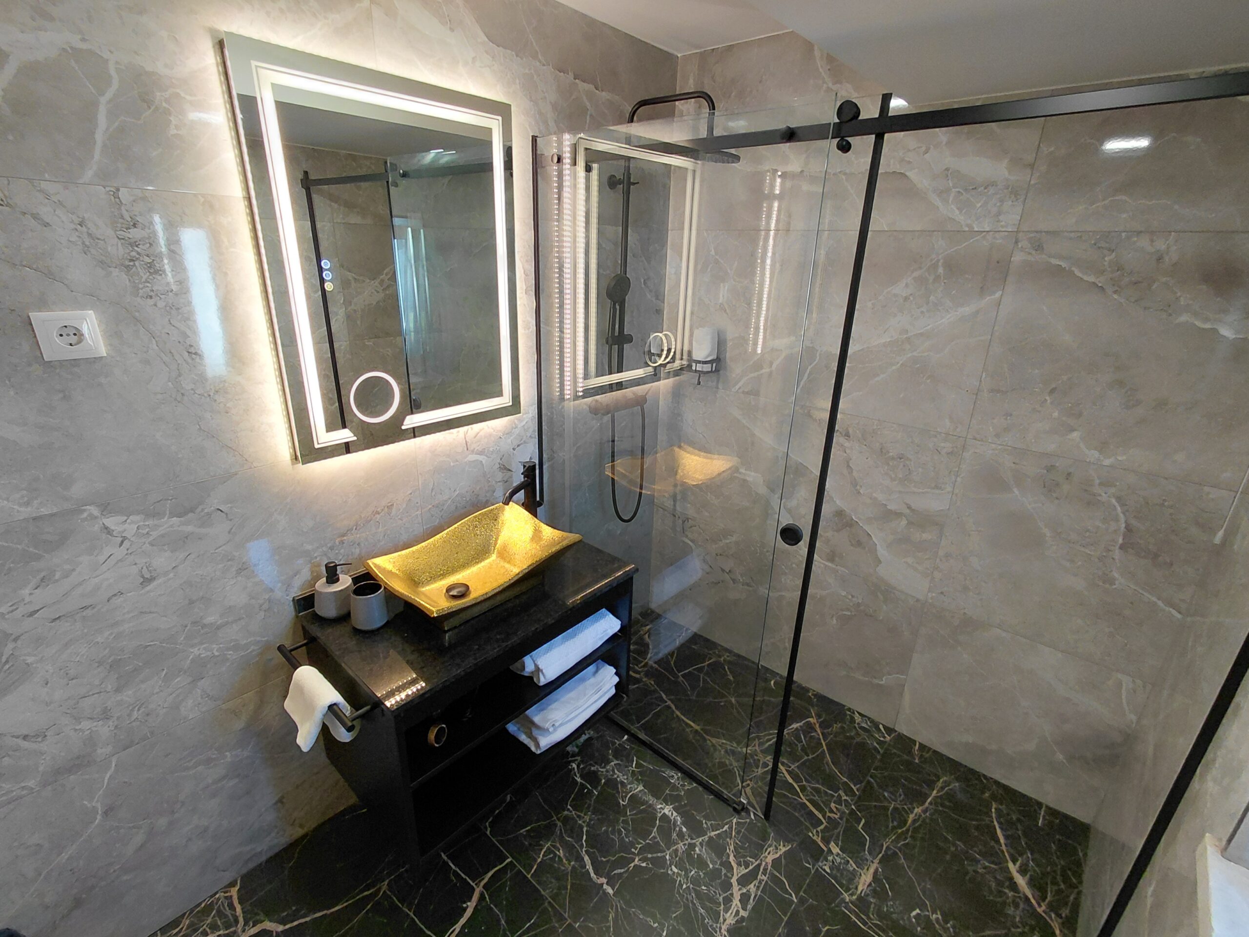 Bathroom Amenities: Illuminated multi-function wall mirror with defogging feature, make-up/vanity mirror, oversized walk-in shower, curated hygiene essentials, shower cap, and professional-grade hair dryer